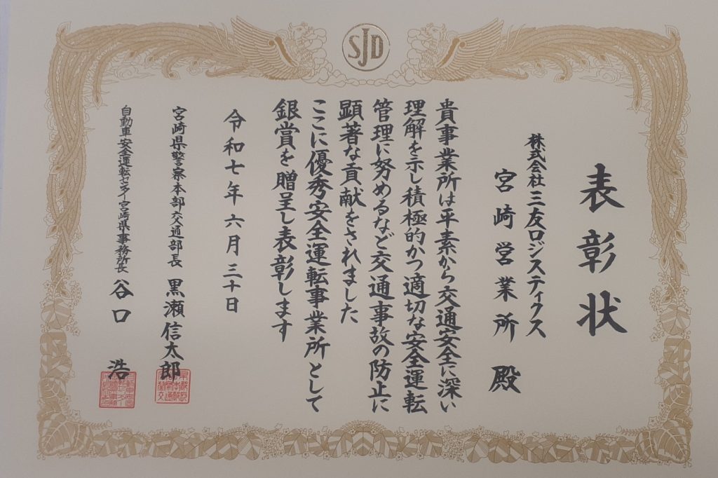このたび弊社三友通商グループ㈱三友ロジスティクス宮崎営業所は、宮崎県警察本部および自動車安全運転センターより、令和7年度 優秀安全運転事業所表彰において『銀賞』を受賞し、表彰されました。